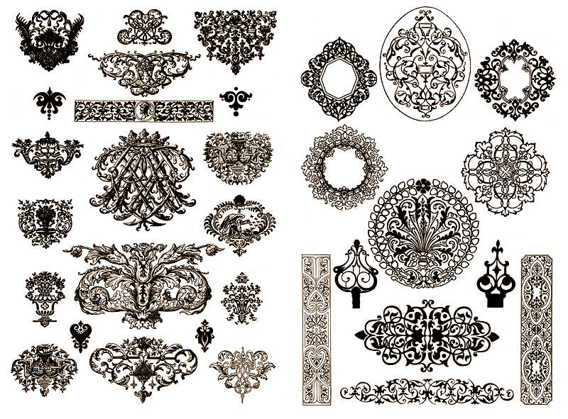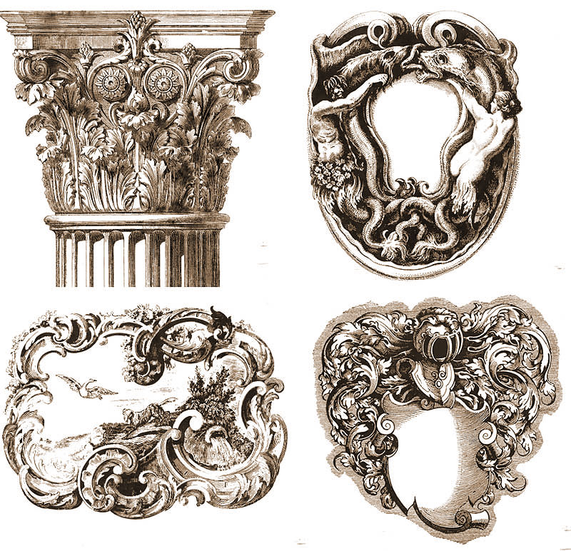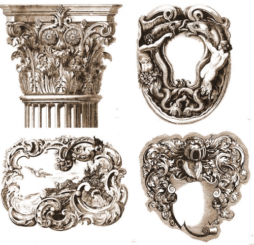 Среди орнаментов барокко: ормушль (Ohrmuschel - ушная раковина), сочетающий картуш с ленточным переплетением и гротесками (Изобретен во Фландрии в конце 16 века), кнорпельверк (Knorpel - хрящ и Werk - работа) - узор барокко, в рисунке которого маски, морды чудовища или гребень морской волны, получил особое распространение в работах мастеров Германии 17 в; Страпворк (strapwork), Ролльверк (Rollwerk от Rolle - ролик, катушка, сверток и Werk - работа) - полуразвернутый рулон пергамента с надрезанными краями. Часто обрамляет собой картуш, трельяж (treillage -решетка) - в виде косой сетки, украшенной мелкими розетками (характерный орнамент стилей Людовика XIV и рококо), ламбрекен, напоминающий одноименную штору.