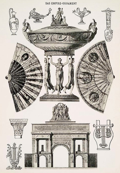 Ампир, орнамент которого привлекателен для людей сильных, властных, высоко оценивающих свое положение в обществе, зародился в глубинах классицизма, во времена, предшествующие Французской революции. Античная архитектура, начинающая входить в моду, декларировала достоинство, серьезность, строгость и торжественность. В 1799 г. в послереволюционной Франции была установлена диктатура Наполеона, которого поддерживал молодой буржуазный класс. С 1804 г. Французская Республика стала империей, а Наполеона провозгласили французским императором. Новый император стремился утвердить свою власть в глазах всего мира, воплотив ее в живописи и архитектуре, чем способствовал развитию парадного искусства, которое получило название "ампир" (от слова "империя"). Классицизм стал для ампира основой, на которой базировалась архитектура того времени. При этом дизайн в стиле ампир отличается от классицизма времен правления Людовика XVI. Классицизм основывался на демократических идеалах Древней Греции периода Перикла. Наполеон же стремился отождествить себя с великими римскими императорами. После свободного классицизма ампир был внедрен "сверху", исходил от самого императора, поэтому мастера различных видов искусств должны были ориентироваться исключительно на величественную архитектуру Древнего Рима периода завоеваний.