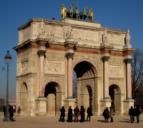 Триумфальная Арка Карузель (l’Arc de Triomphe du Carrousel). Дизайн в стиле ампир копирует античное сооружение Септимия Севера.