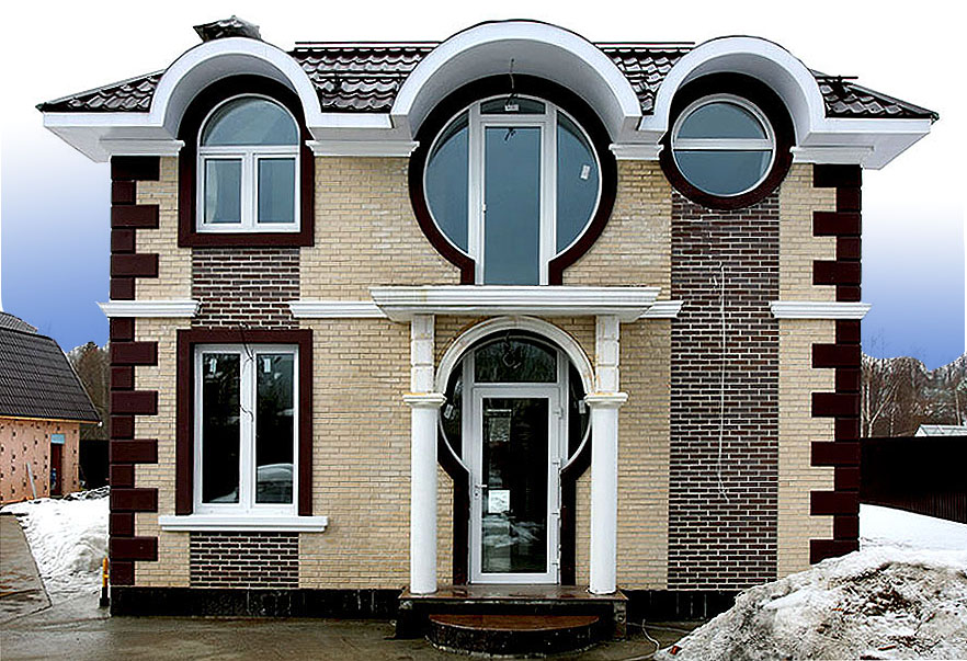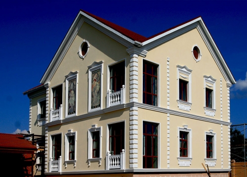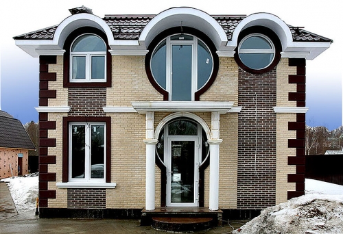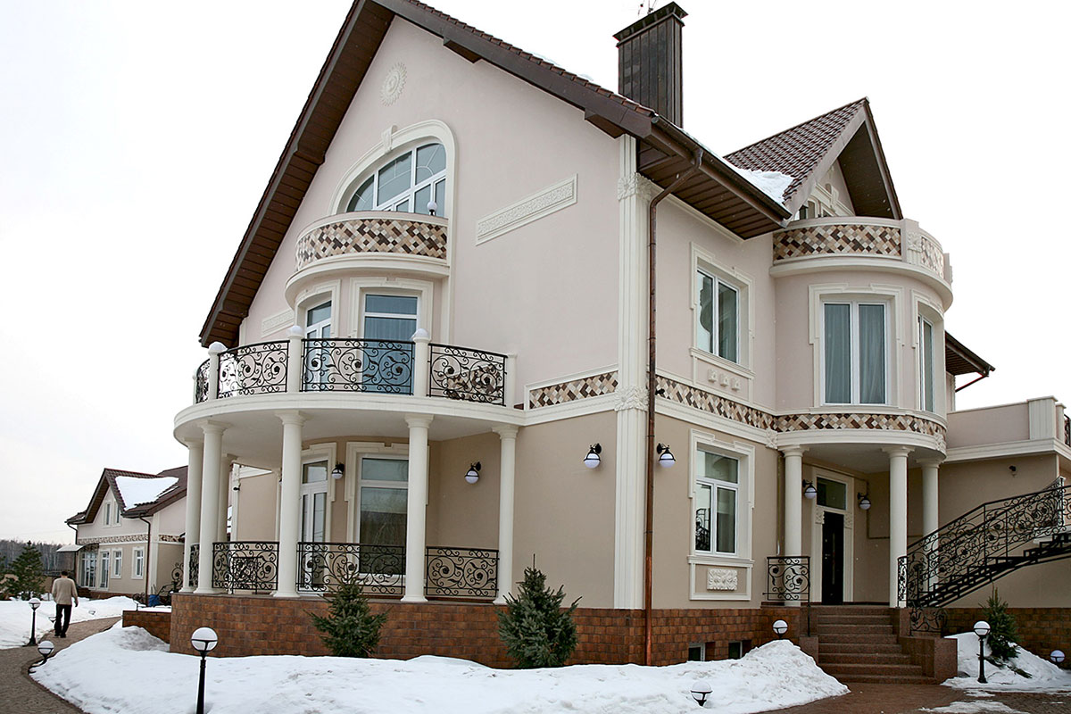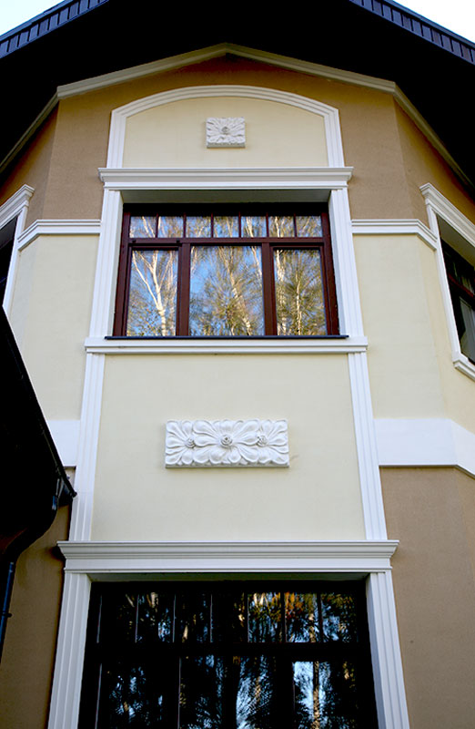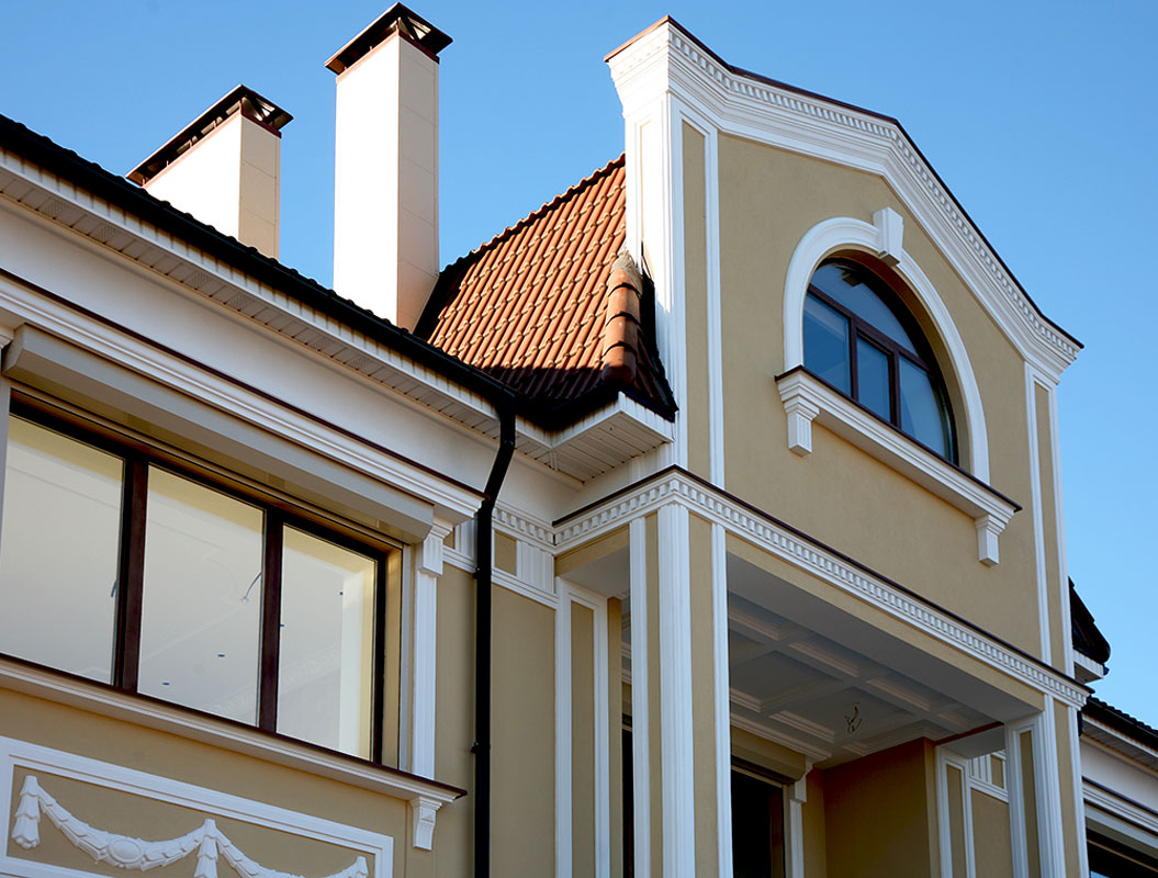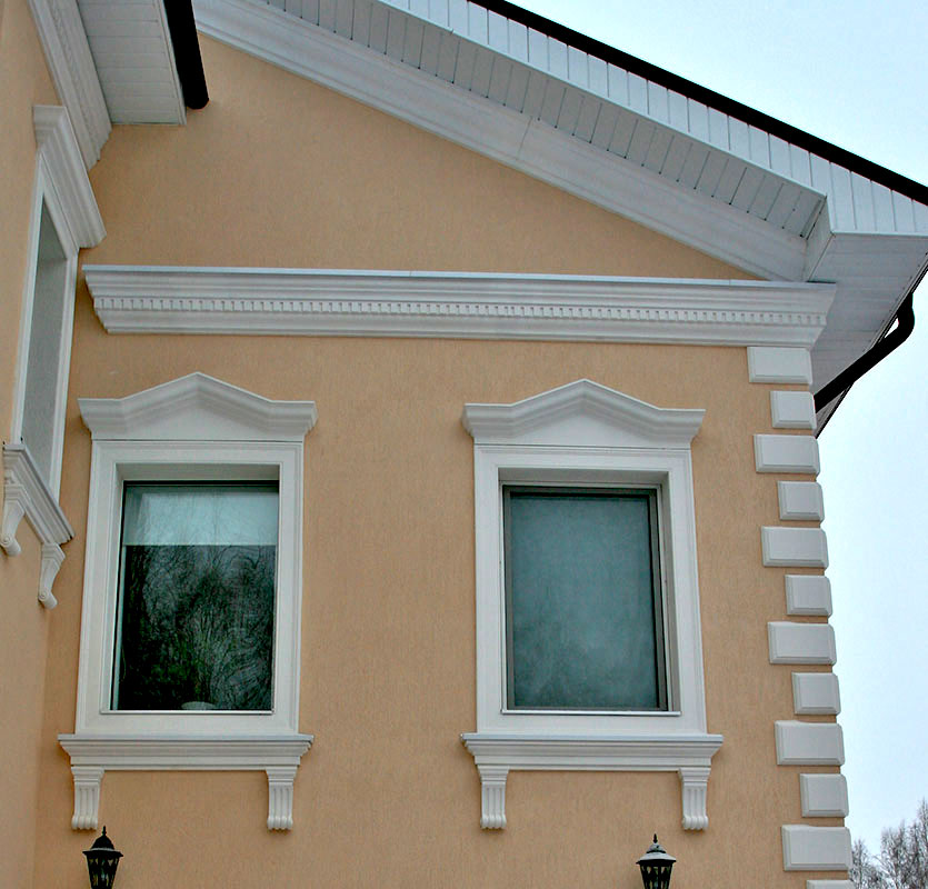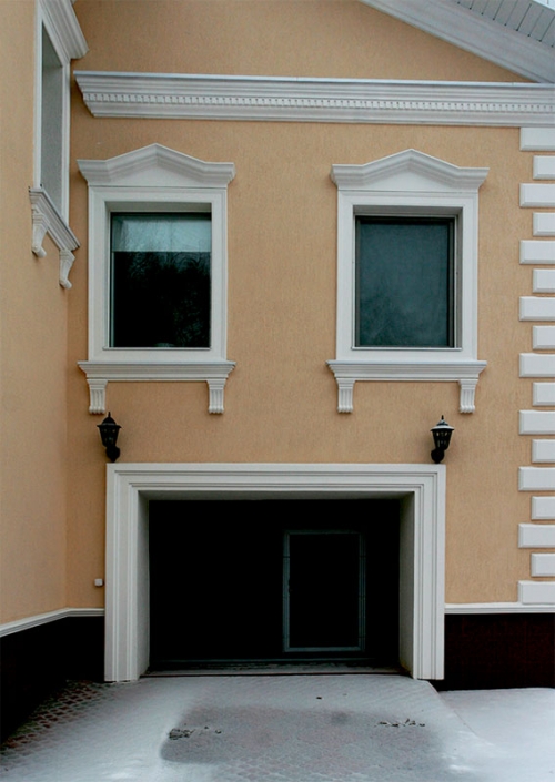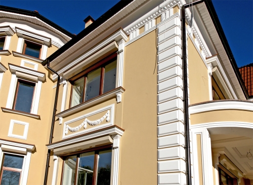 При возведении домов стиль декорирования выбирают в соответствии с собственным вкусом, ландшафтом, площадью участка, обзором фасада со стороны улицы. Декор для фасадов может быть изготовлен как из традиционных материалов, так и из нового легкого искусственного материала, что существенно приблизит окончание строительства.