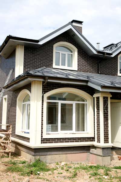 Считается, что декоративная лепнина из архитектурного полиуретана обязательно подразумевает тщательно оштукатуренные стены. Однако, полиуретановый декор с успехом используется и для отделки фасадов кирпичных домов или облицованных, как этот коттедж, клинкерной плиткой.