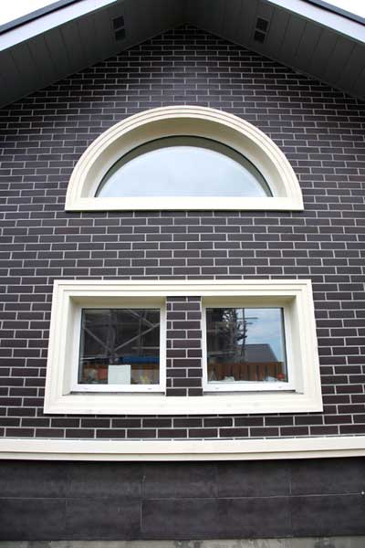 Основным приемом, использованным для отделки фасада кирпичного дома или подобного ему, стало оформление окон радиусными арочными завершениями, выполненными по индивидуальному заказу. Для бокового и нижнего обрамления окна был подобран молдинг мм0050 подходящего профиля.