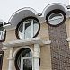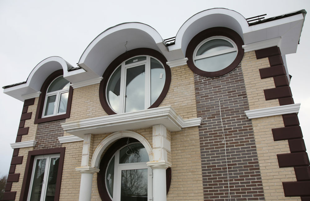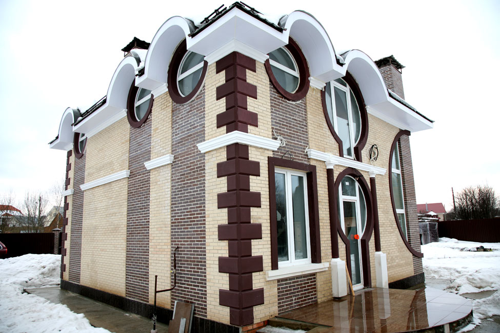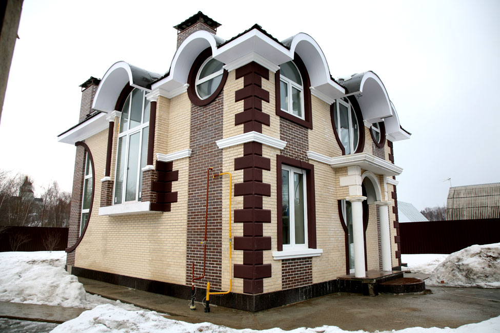 При оформлении фасада частного дома было применено контрастное окрашивание элементов декора. Белые декоративные элементы дополнены декором цвета горького шоколада, совпадающими по окраске с некоторыми кирпичами стен. Для основного фона стен выбран нежный цвет айвори.