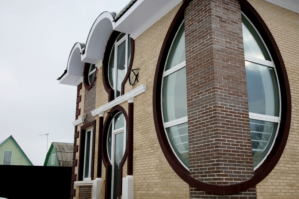 Контрасты присутствуют не только в цветовом решении декора стен дома. Геометрически декоративные элементы представляют собой самые простые базовые формы противоположные друг другу: круг и прямоугольник. Декор стен является логическим продолжением архитектурных решений проекта: соперничают круглые и прямоугольные окна, двери стандартной формы вписаны в окружность, большое круглое окно, разделено пополам углом дома.