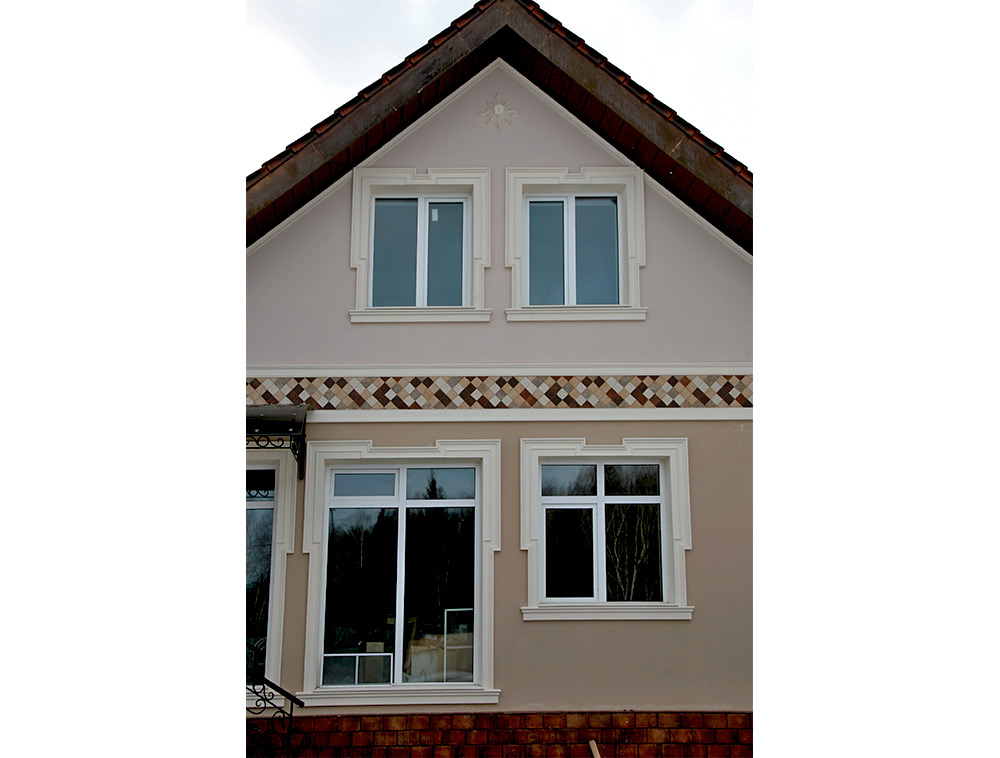 Придать нетривиальную форму обрамлениям окон удалось за счет оригинального использования молдинга мм0230. Состыкованные части молдингов под углом 90 градусов (молдинг был распилен под углом 45 градусов) позволили создать нестандартные сандрики. Тонкие окантовки из молдингов выделяют под окнами декоративные панели, украшением которых служит мелкий лепной декор с цветочными узорами (де0060).