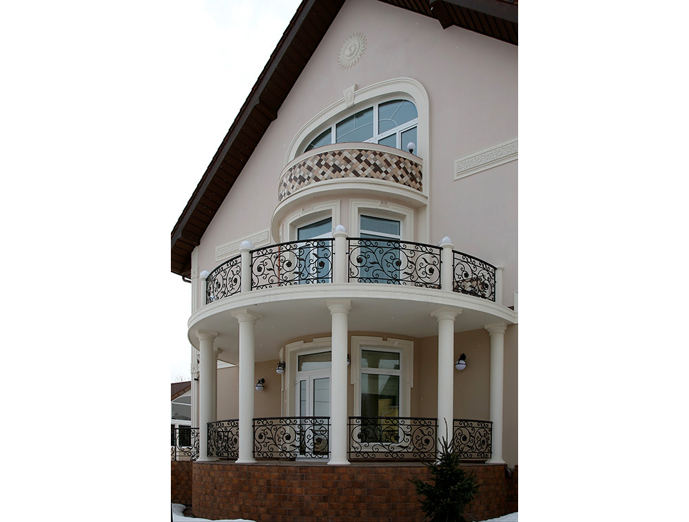 Полукруглые балконы с двух сторон здания поддерживают дорические колонны кл7045, замененные у стен фасада аналогичными полуколоннами. Гладкие стволы колонн служат опорами для ажурного кованного ограждения с традиционными для стиля модерн флористическими мотивами. Несущие конструкции из металлических труб, благодаря обрамлению из архитектурного полиуретана, преобразились в изящные дорические колонны (каждая составлена из двух полуколонн).