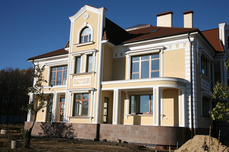 Особняк в Тульской области – это яркий пример правильного использование богатой палитры традиционных приемов, составляющих гордость классической архитектуры. Декорирование постройки лепниной из архитектурного полиуретана (Архитана) было запланировано еще на стадии проектирования здания, поэтому удалось создать законченный и целостный образ. Продуманное размещение архитектурного декора фасада, позволило эффектно подчеркнуть конструктивные особенности здания.
