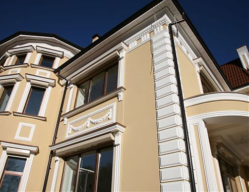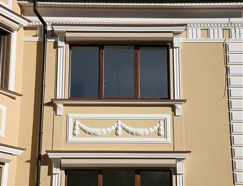 Основу архитектурного фасадного декора при оформления окон создали, размещенные по бокам оконного проема молдинги мм7230 с двумя гранями, расположенными под 90 градусов друг к другу. Обязательным условием проекта была установка на всех окнах дома рольставен. Поэтому для того, чтобы не нарушать гармоничного облика дома, была разработана специальная конструкция молдингов, выполненная по индивидуальному заказу, которая позволила задекорировать короба рольставен. Под подоконниками с металлическими отливами также размещены подоконные элементы из полиуретана. Таким образом, лепные декоративные элементы смягчают рубленые линии современных утилитарных деталей, и пластиковые окна не диссонируют с общим оформлением фасада дома в классическом стиле.