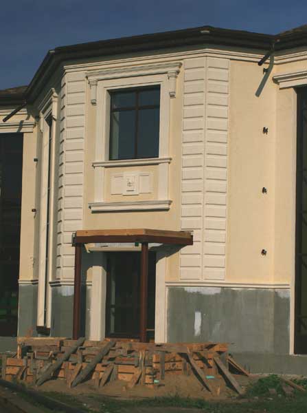 Как правило, в декоративной отделке стен и фасадов лепной декор резко контрастирует по цвету с основным тоном здания. Отличительной особенностью данного проекта является то, что в наружном оформлении фасада упор сделан на структуру полиуретанового декора. Преимуществом архитектурного полиуретана является что, что на него хорошо «ложатся» и фасадные краски, и декоративные штукатурки. Это свойство было в полной мере использовано в оформлении фасада данного особняка – благодаря использованию рельефных декоративных штукатурок при его отделке, воссоздана текстура природных материалов. Шероховатость камня, сеть жилок натурального дерева перемежают абсолютно гладкие поверхности. Подходящим фоном для такого разнородного декора стала штукатурка с эффектом кракелюра.