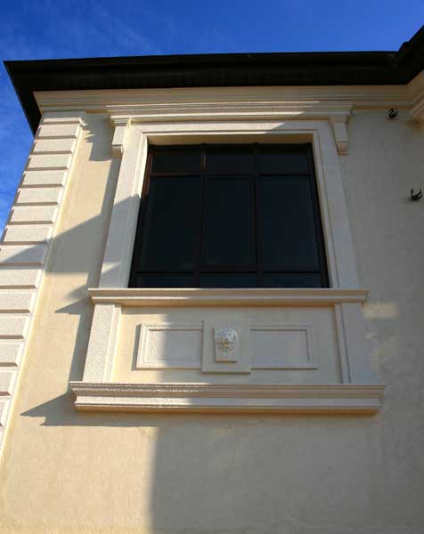 При оформлении фасада окнам было уделено особое внимание. Обрамлением окон служат прямоугольные ступенчатые молдинги мм0240. Они заходят далеко за нижнюю границу окна, образуя боковое обрамление декоративной панели, расположенной непосредственно под окном. Оформление верхней части окна на фасаде образует сандрик из молдинга мм0262 профиль которого меняется от полочки к каблучку, желобу и валу и парные консоли кс0100. Этот же молдинг образует нижнюю границу декоративной подоконной панели. Молдинг мм0690 использован для изготовления подоконного элемента и для оформления грани цоколя.