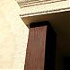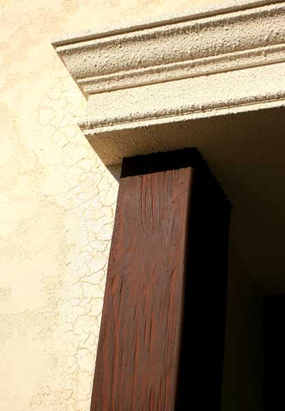 Для придания наружному оформлению фасада более уютного вида классический светлый лепной декор дополнен использованием деревоимитации – поверхность полиуретановых изделий этой серии воспроизводит текстуру натурального дерева. В оформлении крыльца была использована фигурная балка б0025 сложного профиля, образующая оригинальный козырек над ступеньками. Балку поддерживают две темно-коричневые колонны пк7055.