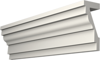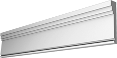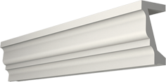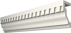Наиболее сложным по форме декоративным элементом во внешнем декоре загородного дома является массивный составной карниз, проходящий по нижней границе фронтона центрального фасада и под свесами кровли по боковым фасадам. Верхнюю часть карниза составил молдинг мм0500, в котором сочетаются классические профили каблучок и полочка, а нижняя часть карниза – это молдинг мм0480 с рельефно выступающими над поверхностью прямоугольными сухариками. Несмотря на довольно простой рисунок карниз в сборе представляет собой необычный и эстетически привлекательный декоративный элемент отделки фасада загородного дома. Широкая полоса карниза несколько скрадывает высоту остроконечной крыши, делая всю постройку более пропорциональной.