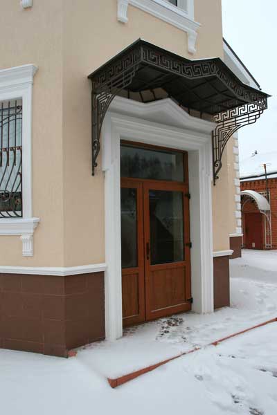 Надоконные элементы с треугольными фронтонами (сс0021) встречаются в оформлении фасада загородного дома как на первом, так и на втором этажах. Наверху они украшают окна, а внизу сандрик использован для обрамления входной двери. Интересная деталь: козырек над крыльцом повторяет форму сандрика, позволяя любоваться декоративной наддверной лепниной с любой точки обзора. Дополнительная лента (молдинг мм044), концы которой запилены под углом 45 градусов, сделала переход от крупного сандрика к боковым обрамлениям двери более гармоничным.