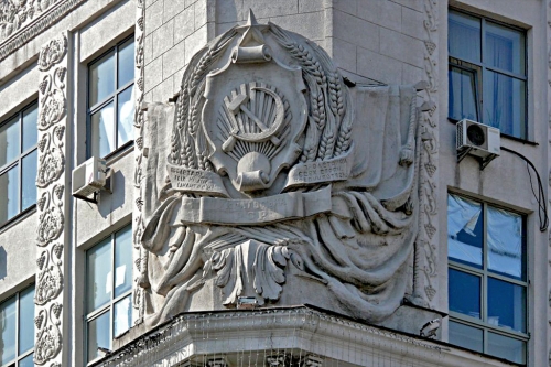 В эпоху сталинского ампира и советского классицизма на барельефах стали изображать советскую символику, фигуры рабочих, колхозников, военных, спортсменов, выполненных в манере соцреализма. Размеры барельефов стали больше, иногда они занимали все свободное пространство стены. Часто стали использовать ленточные барельефы, на которых изображались повествовательные сюжеты.