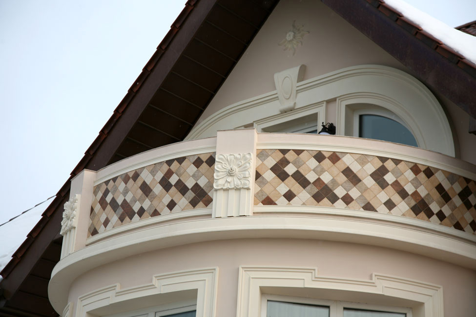 Радиусная балюстрада из полиуретана на фасаде дома.