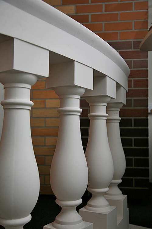 Если балюстрада радиусная изготавливается из дерева, то гнутый поручень и основа (если она требуется) производятся путем последовательного склеивания шпона, чтобы создать нужный изгиб. Это трудоемкая работа, занимающая много времени и требующая мастерства исполнителя. Соответственно, и стоимость такой работы весьма высока. Со временем такая балюстрада может начать растрескиваться под действием напряжений и разрушаться Работа с металлическими балюстрадами радиусными тоже не является простой, так как требует специальных технологий и аппаратуры для изготовления перил и основания. Трудоемкий процесс изготовления балюстрады радиусной из бетона и камня, что также сказывается на сроках и стоимости. Металлические гнутые балюстрады долговечнее, чем деревянные, однако, есть большая вероятность корродирования металла, что приведет к изменению внешнего вида ограждения и его разрушению. Изготовление полиуретановых балюстрад прямых и радиусных решает несколько задач одновременно. Полиуретан – полимерный материал, которому легко придать нужный изгиб, залив его при производстве в специальную форму. Материал хорошо справляется с нагрузками, так как не подвергается изгибу в холодном состоянии. Полиуретановые балюстрады радиусные и прямые служат долго, не разрушаясь и не изменяя внешнего вида. Они не поддаются воздействию воды и перепадам температур, что делает полиуретан удобным материалом для оформления фасадов и ландшафтной архитектуры, интерьеров с высокой влажностью. Его инертность делает полиуретан безвредным для здоровья людей. Он не горюч и способен выдерживать нагрузки, сопоставимые с деревянными изделиями. Усилить балюстрады прямые и радиусные из полиуретана можно при помощи металлической арматуры, размещаемой внутри полых полиуретановых элементов. Кроме того, благодаря подобранной окраске, можно создать имитацию любого материала, который подходит для определенного архитектурного стиля.