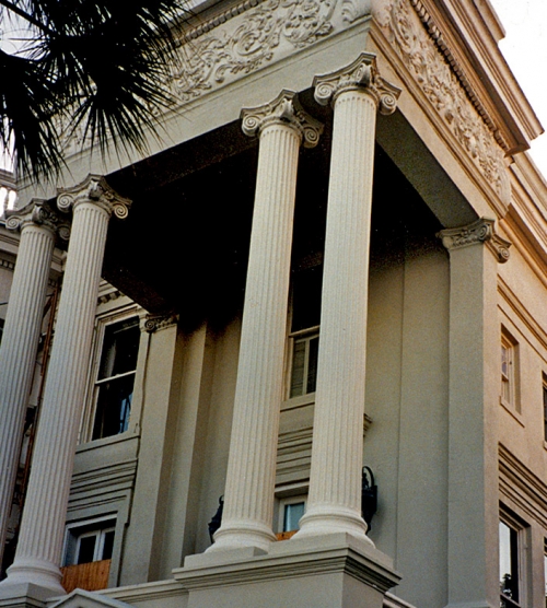 Лепнина на колоннах в совокупности с рельефом на фризе, карнизом и другими архитектурными элементами, определяет классический дизайн фасада.