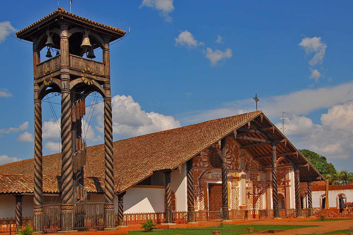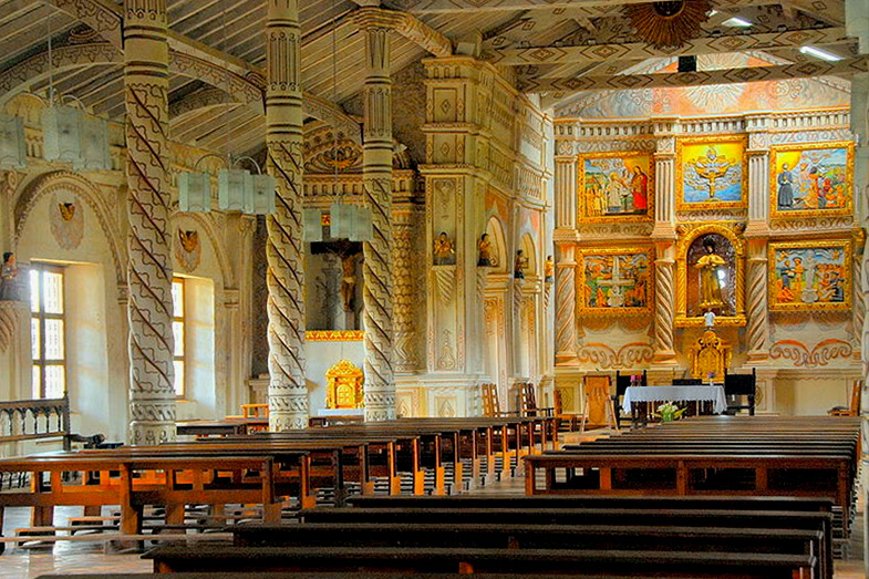 Резные витые колонны боливийской Чикитании сделаны из цельного ствола дерева породы Пало Санто с очень прочной древесиной.
