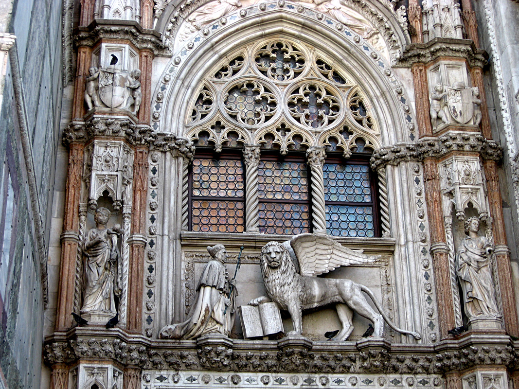 Пример барельефов, сочетающихся со скульптурой и другим архитектурным декором. Дворец Дожей. Венеция.
