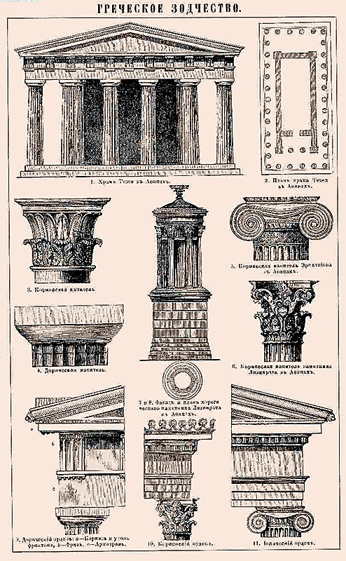 Венчающая часть колонны или пилястры ионического ордера отличалась специфическими завитками лепного декора: волютами. Другой важный элемент капители - полоска с лепным яйцевидным орнаментом - киматием. Между капителью и антаблементом располагается узкая полоса с рельефным орнаментом. Завитки, украшающие капитель ионической колонны, располагались в одной плоскости параллельно фасаду. Рисунок ионической капители колонн на фото внизу