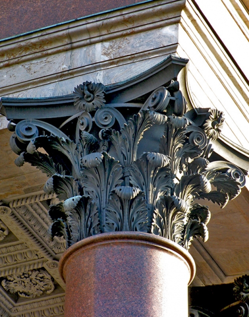 Венчающая часть колонны или пилястры называется капителью. Это слово было производным от латинского обозначения головы, вершины. Капитель зрительно соединяет вертикальную конструкцию ствола колонны и горизонтальное перекрытие - антаблемент. Пилястры - выступающие элементы на поверхности стен - могут иметь сходные с колоннами элементы: базу, ствол и капитель. От внешнего вида верхней части колонны или пилястры во многом зависит общее восприятие стилевого направления в оформлении фасада. Пример капители колонны на фото ниже.