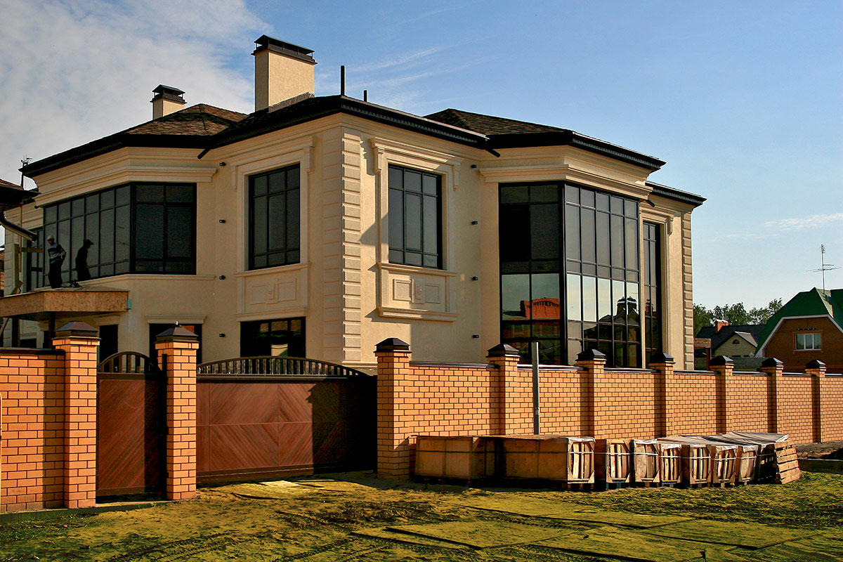 Лепнина украшает дом смешанного стиля, сочетающего элементы классики и урбанизма.