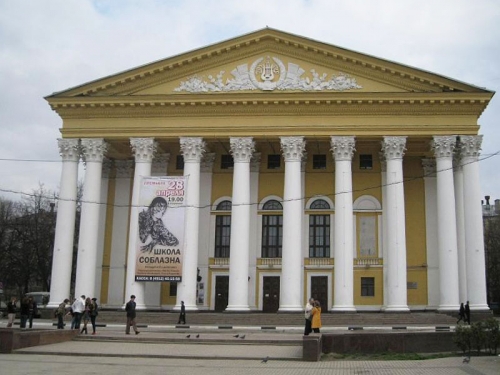 Советский классицизм. Рязанский Государственный Областной Театр Драмы. (конец 1950-х гг.-1961 г). Автор проекта— архитектор И.Н. Чистосердова, автор эскиза барельефного панно фронтона — художник К.К. Шелковенко.