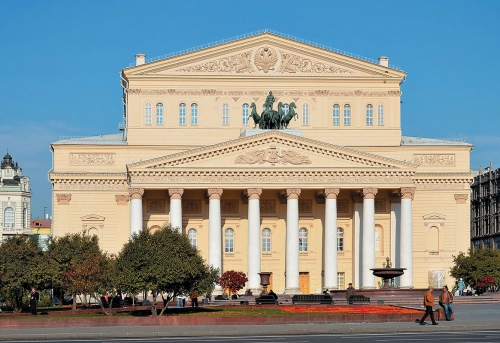 Большой театр. Классический фасад театра декорирован скульптурами муз Эрато и Терпсихоры, над фронтоном установлена квадрига Апполона, скульптора П. Клода (квадрига в античности считалась символом военных побед, в классицизме европейском Апполон в квадриге - символ изящных искусств, в ампире квадриге возвращалось ее триумфальное значение).