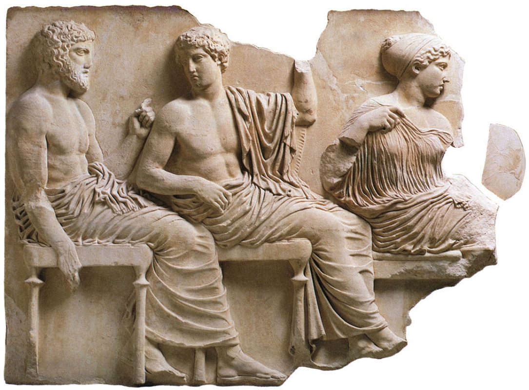 Барельеф с восточного фриза Парфенона. Посейдон, Аполлон и Артемида. Мрамор. 440 г. до н. э. Афины, Музей Акрополя.