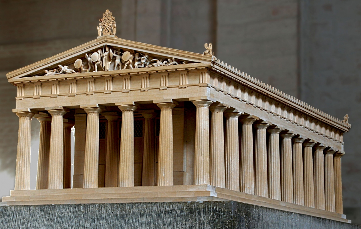 Модель храма Афины Афайи на острове Эгина с декорированным восточным фронтоном.