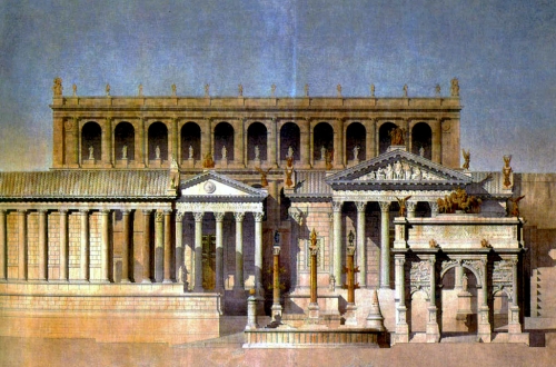 Визуализация сооружений Древнего Рима, декорированных скульптурами и рельефом. Храм Сатурна, Храм Веспасиана, Ростра, Храм Согласия, Триумфальная арка Септимия Севера. Табуларий на заднем плане.
