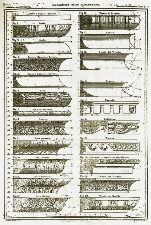 Архитектурные профили из работы "Правила пяти ордеров архитектуры" Д.Виньолы, сделанные на основе римских развалин.