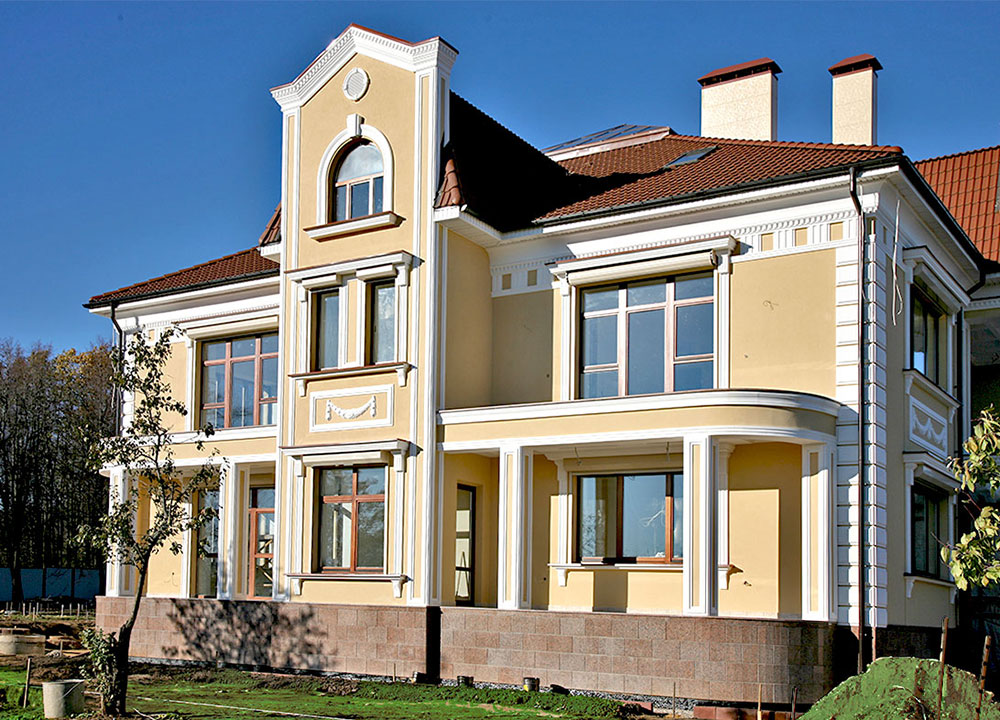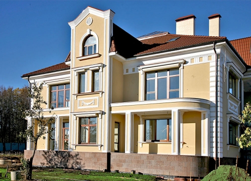 Можно создавать новые формы декоративных деталей из полимеров по индивидуальным эскизам или же использовать копии со знаменитых образцов. Очень интересен резной декор в деталях фасадов в национальных стилях, где искусственный материал практически не отличим от натуральной древесины. Монтаж изделий из искусственных материалов - полиуретана и деревокомпозита - осуществляется достаточно просто, не требует специальных крепежных конструкций. Кроме того, небольшой вес позволяет проводить декорирование фасадов без усиления фундамента. Современные декоративные детали из полиуретана можно использовать и для скрытой подсветки, которая выгодно подчеркнет элементы фасада в вечернее время. Профили, карнизы, сандрики могут скрывать конструктивные части фасада и замаскируют дефекты.