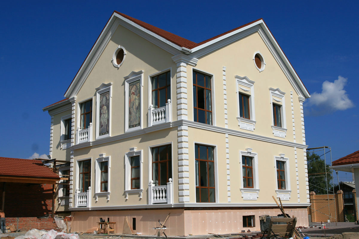 Профили, карнизы, сандрики, угловые элементы, молдинги на здании сделаны из полиуретана.