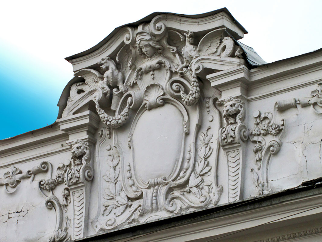 В эпоху классицизма декоративный дизайн строго канонизирован ордерной системой. Замковые камни, которые встречают усилие конструкции арок и расположенные по центру над окнами и дверями, оформлены в виде масок львов или человеческих лиц. К декоративным решениям русского классицизма относятся рельефные горизонтальные композиции с мифологическими сюжетами, которые языком аллегории передают о назначении сооружения: суд, работный дом, школа, университет, театр, библиотека, больница, почта и т.д. Такой рельеф располагался в центре фасада над окнами одного из этажей. Горизонтальные барельефы в сочетании с розетками, медальонами образовывали ленточный декор и опоясывали здание. После победы над Наполеоном искусство декора акцентировалось на изображении военных трофеев: доспехах, оружии, лавровых венках, фигурах славы, трубах, барабанах, флагах. Здания в Петербурге украшали атлантами, кариатидами, сюжетными композициями и барельефами.