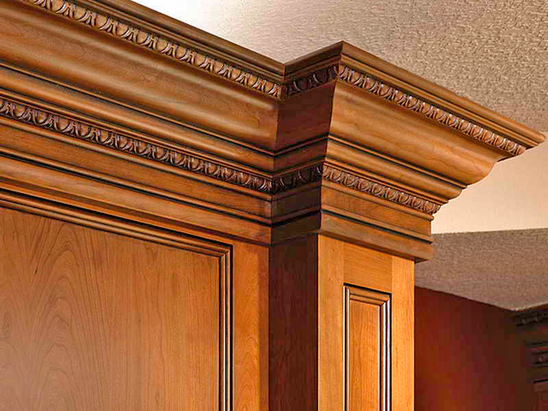 Деревянный алак из профиля сложной криволинейной формы соединяет верхнюю часть шкафа с потолком, тем самым создавая единую гармоничную композицию.