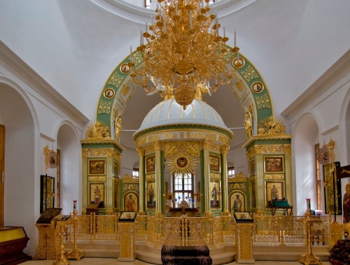 Алтарная преграда Знаменской церкви представляет собой невысокий ажурный металлический барьер, перед которым установлены аналои.