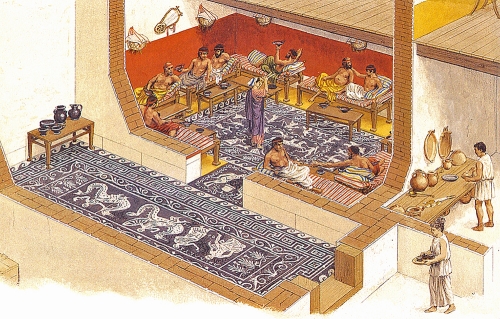 Андрон был главным залом античного дома, поэтому там проводились ритуальные пиры в честь божеств. Торжества сопровождалось музыкой, а андрон украшался венками из мирта и плюща.