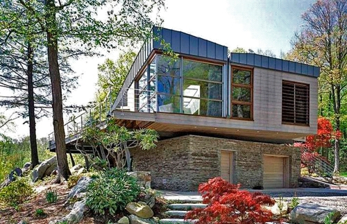 Один из современных американских коттеджей, архитектоника которого заметна в общей гармонии строгих форм сооружения и природных материалов, что идеально вписывается в окружающий ландшафт, создавая цельную композицию.