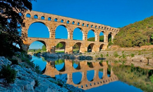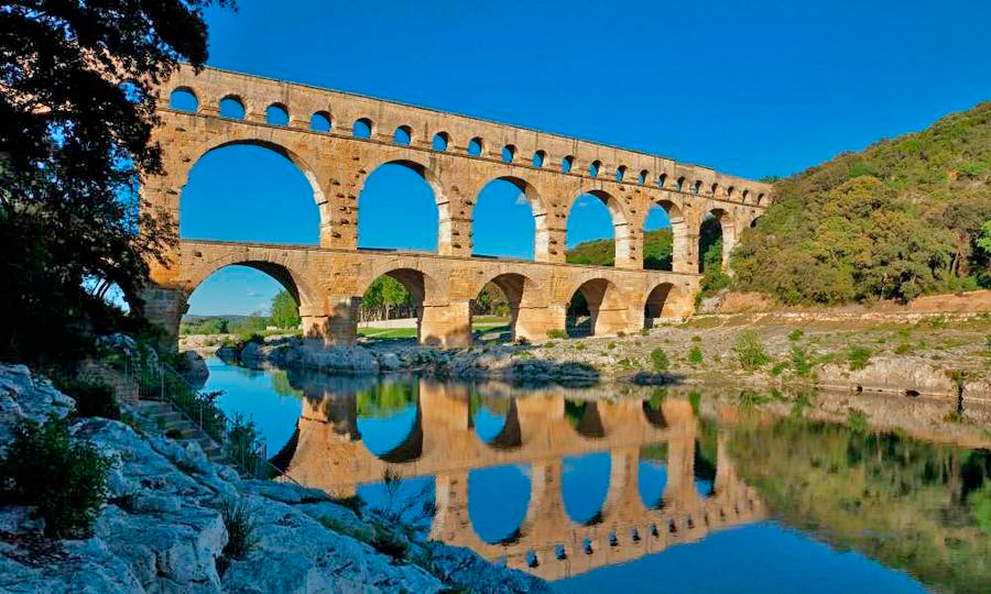 Древнеримский акведук Пон-дюж-Гар во Франции, представляющий собой два яруса аркад, по которым проложены каналы для воды.