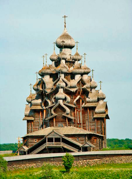Деревянный храм в Кижах является одним из памятников русской архитектуры 15 века, иллюстрируя основные принципы деревянного зодчества: закрытые небольшие балконы и галереи, многочисленные остроконечные наличники и купола.