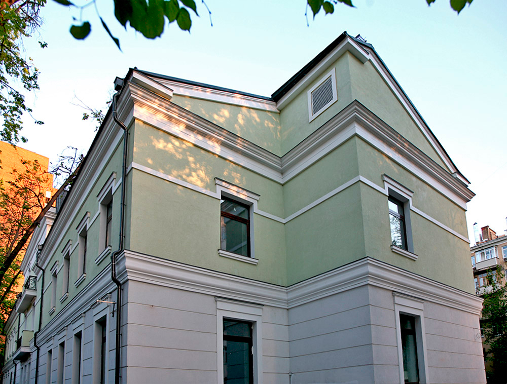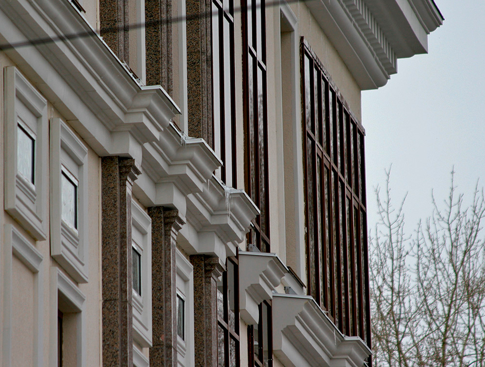 Карниз и межэтажный молдинг, представляющие собой криволинейный тип архитектурного профиля, на фасаде здания, оформленного декоративными элементами из полиуретана коллекции Архитан.