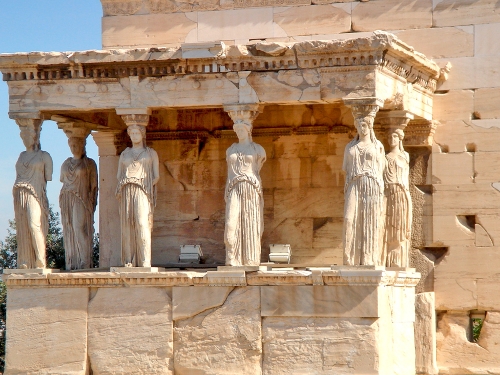 Архитрав портика храма Ники Аптерос поддерживается статуями кариатид и практически лишен скульптурного декора.