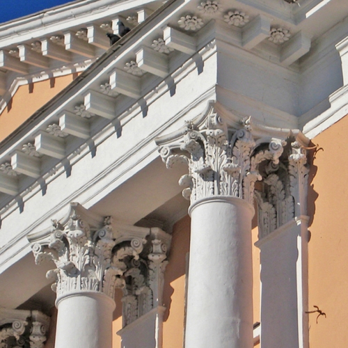Архитрав коринфского ордера обрамлен прямолинейными профилями и лишен дополнительного декора.