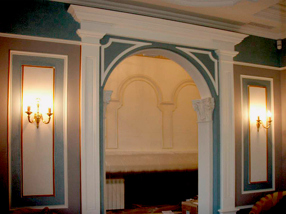 Арка дверного проема современного жилища, у основания которой расположены декоративные лепные пилястры.