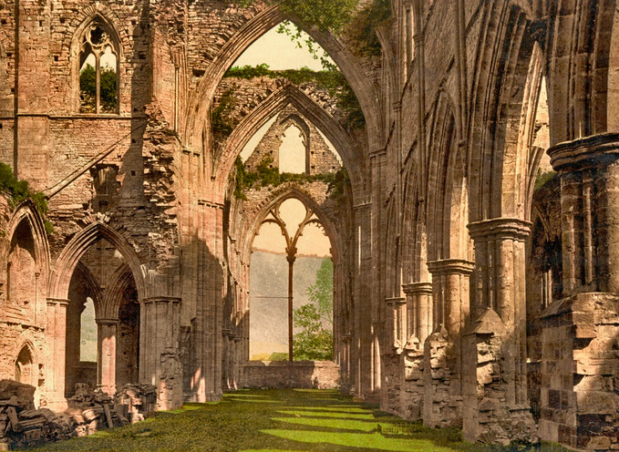 Порталы Аббатства Тинтерн увенчаны стрельчатыми арками, ребра которых дополнены ступенчатыми профилями.