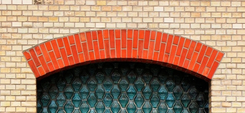 Лучковая арка оконного проема выложена из кирпича другого цвета, что визуально выделяет арку на фоне стены.
