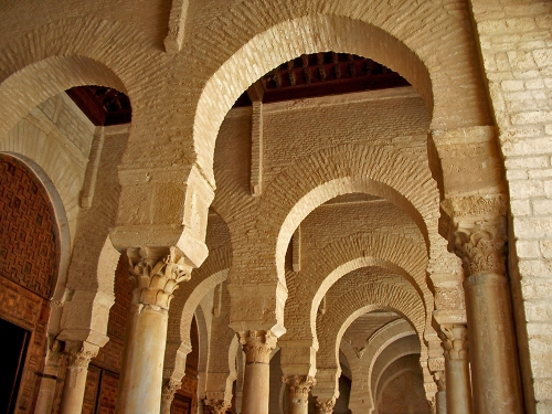 Подковообразные аркады мечети Укба в Тунисе поддерживаются колоннами с капителями, стилизованными под коринфский ордер.
