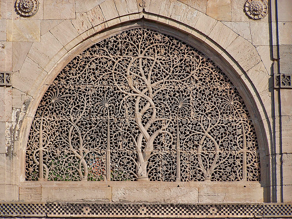 Ажурный узор арочного окна Мавзолея Сиди Саеда Джаали, на котором изображены пальмы и другие деревья – один из наиболее популярных мотивов индийской архитектуры.