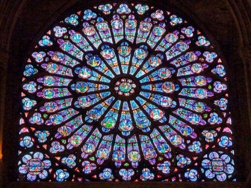 Окно-роза Собора Нотр-Дамм де Пари, декорированное сложным ажурным каменным переплетом, узоры которого дополняют рисунки витражного панно.